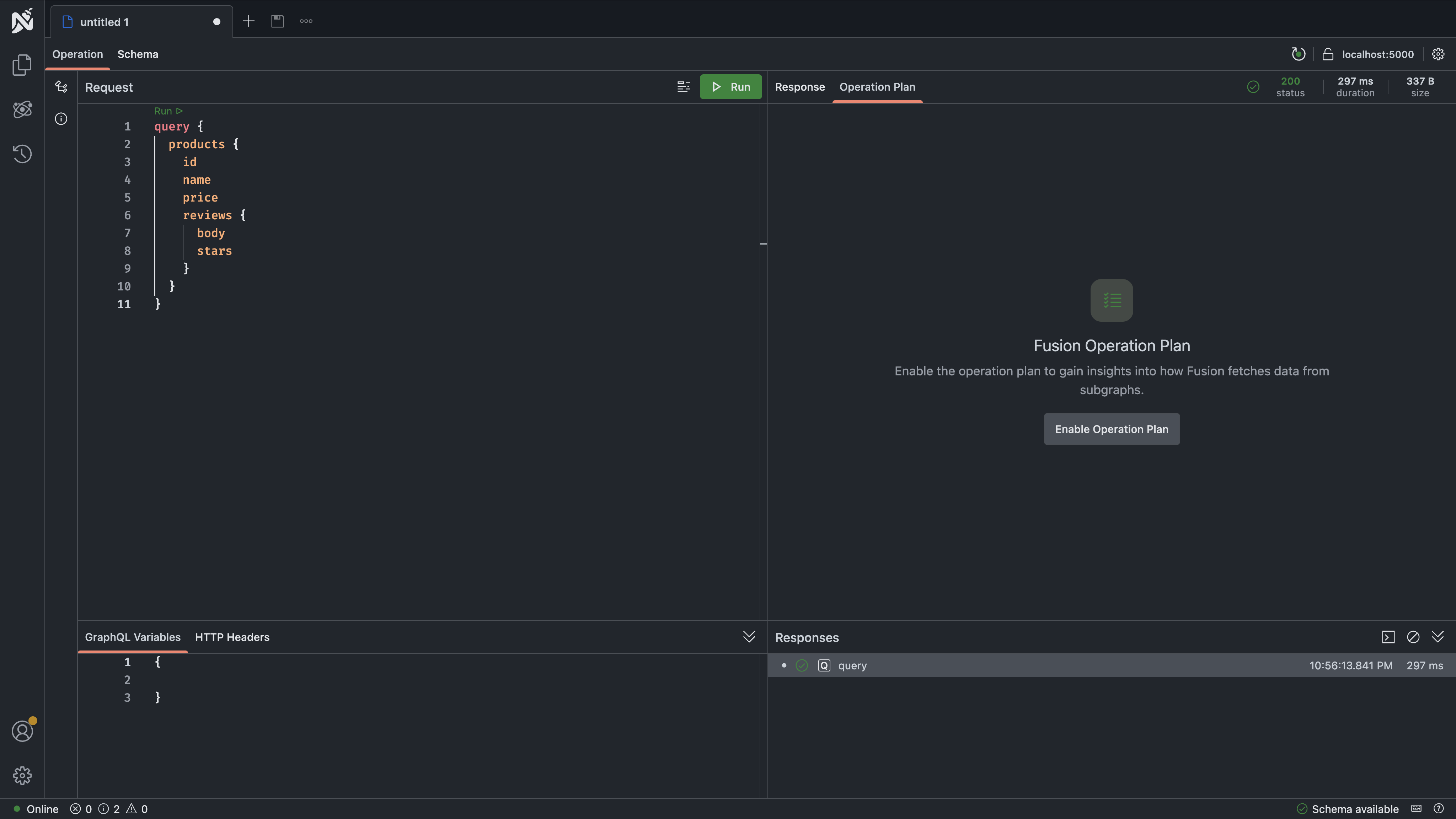 Open your browser to http://localhost:5000/graphql/ to access the Nitro GraphQL IDE on the gateway. Try a simple query to verify the gateway is working: