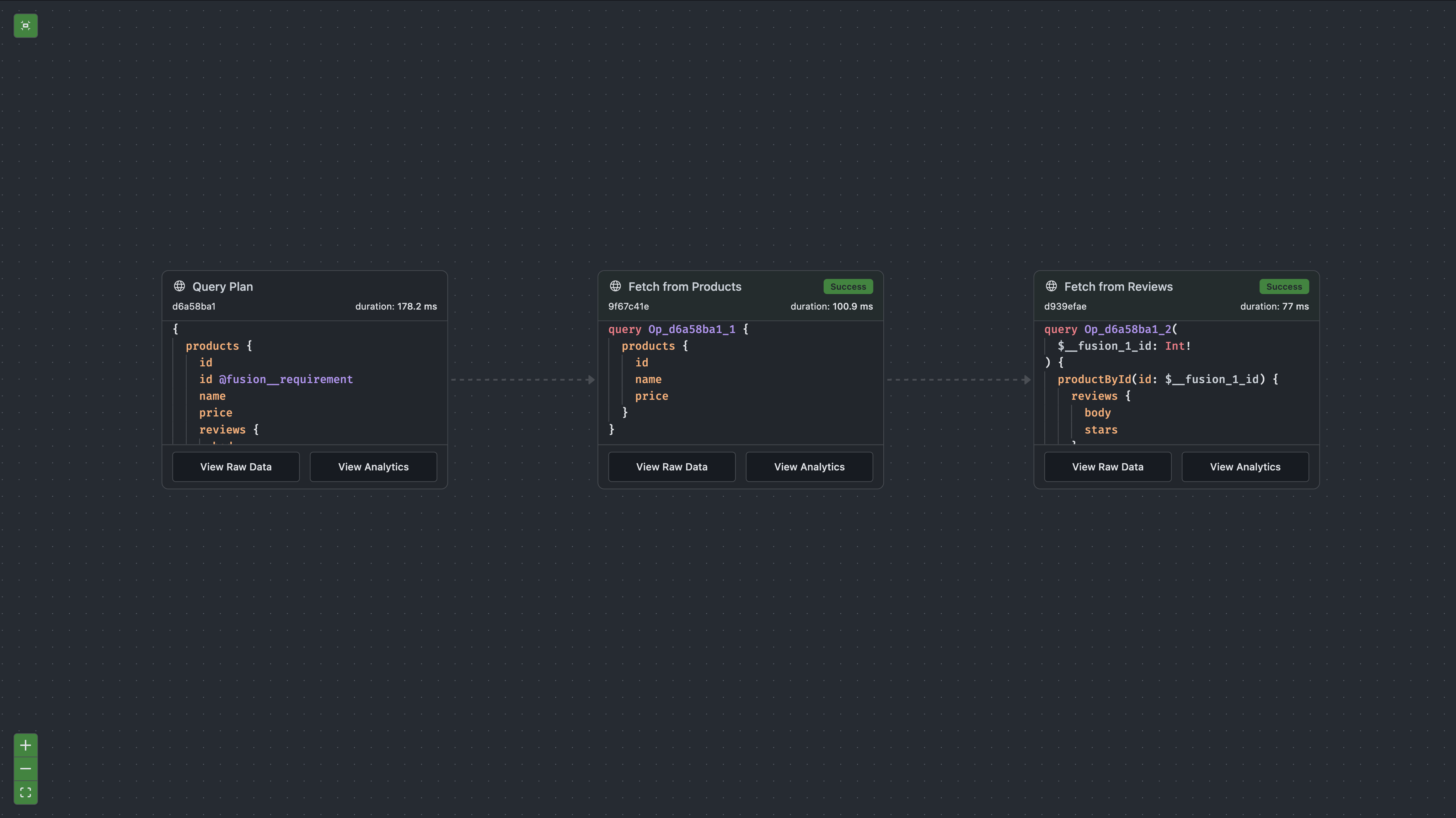 This time, body and stars came from the Reviews subgraph, while product.name and product.price came from the Products subgraph. The gateway resolved the product references by calling the Products subgraph's productById lookup with each review's product ID.