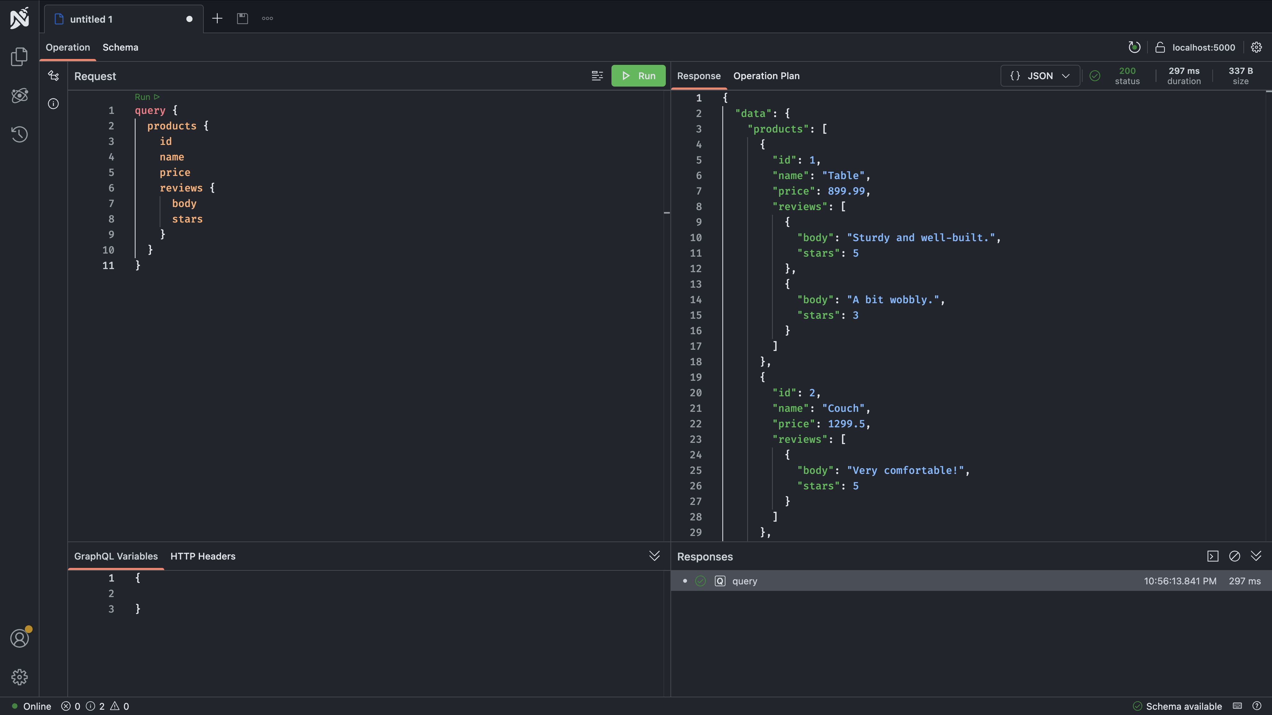 { "data": { "products": [ { "id": 1, "name": "Table", "price": 899.99, "reviews": [ { "body": "Sturdy and well-built.", "stars": 5 }, { "body": "A bit wobbly.", "stars": 3 } ] }, { "id": 2, "name": "Couch", "price": 1299.5, "reviews": [{ "body": "Very comfortable!", "stars": 5 }] }, { "id": 3, "name": "Chair", "price": 54, "reviews": [{ "body": "Good value for the price.", "stars": 4 }] } ] }}