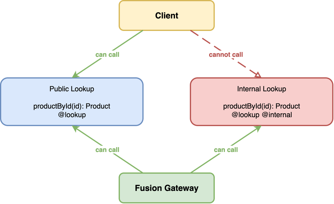 An internal lookup is hidden from the composite schema. Clients cannot call it directly. It exists only for the gateway to use during entity resolution.